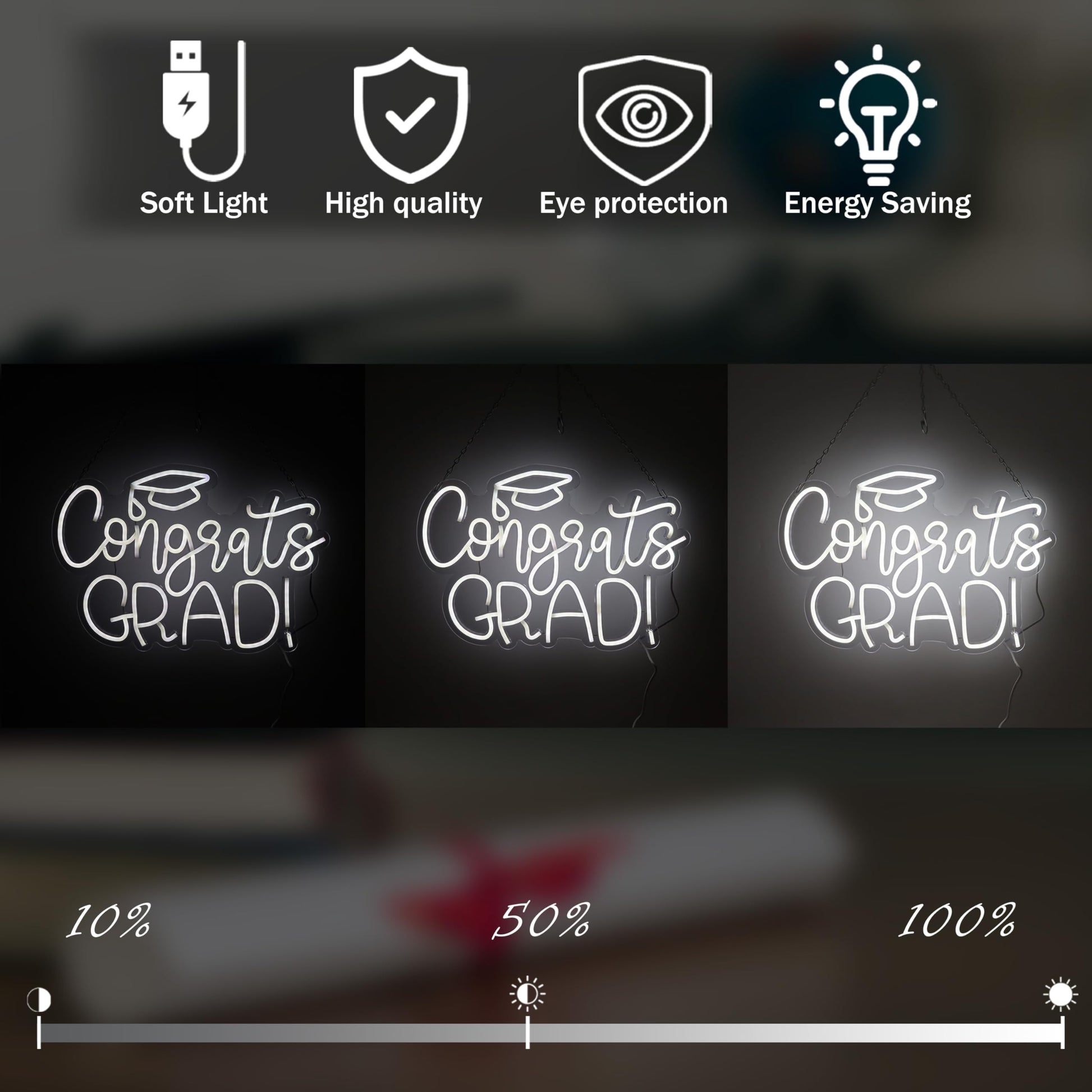 - Easy Installation & Dimmable: With pre-made holes, hooks, and a hanging chain included, hanging your Congrats LED Neon Sign has never been easier. Simply plug the 5.9ft USB cord in, and use the dimming switch to adjust the brightness to your desired level
